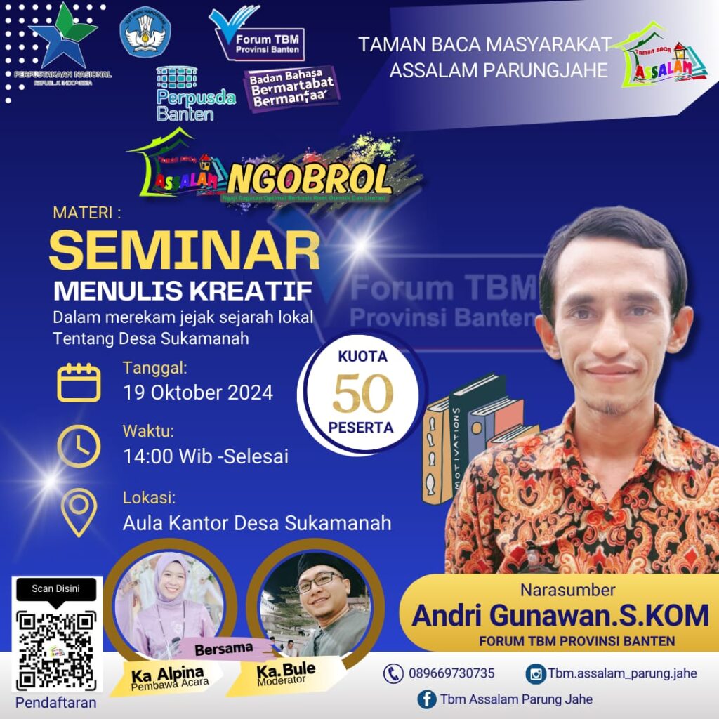 Sukamanah, Jambe – 19 Oktober 2024Aula Kantor Desa Sukamanah, Kecamatan Jambe, Kabupaten Tangerang, menjadi saksi terselenggaranya kegiatan Seminar Menulis Kreatif dalam Merekam Jejak Sejarah Lokal. Acara ini menghadirkan Pak Andri Gunawan, S.Kom, mantan Ketua Forum TBM Kabupaten Tangerang sekaligus penggiat literasi yang telah banyak berkontribusi dalam gerakan literasi di Tangerang, sebagai narasumber utama. Mengangkat Sejarah […]