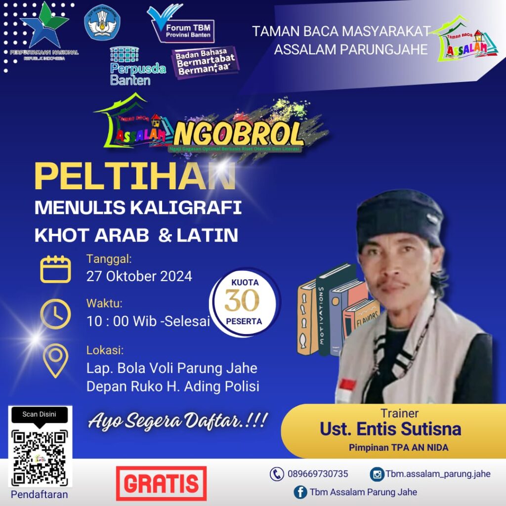 Parung Jahe – 27 Oktober 2024PKBM Assalam kembali melaksanakan kegiatan literasi kreatif melalui Pelatihan Menulis Khat Arab dan Kaligrafi yang berlangsung di lingkungan PKBM dengan penuh antusiasme. Kegiatan ini diikuti oleh warga belajar serta masyarakat yang memiliki minat pada seni menulis indah. Pelatih Kaligrafi Pelatihan ini dibimbing langsung oleh Ustad Sutisna (Entis), seorang praktisi kaligrafi […]